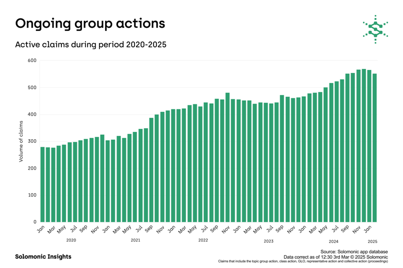 Data from Solomonic shows that, although fewer group actions were filed compared to 2021 and 2022, the number of active cases reached an all-time high by the end of 2024 – almost doubling from 2020 levels.